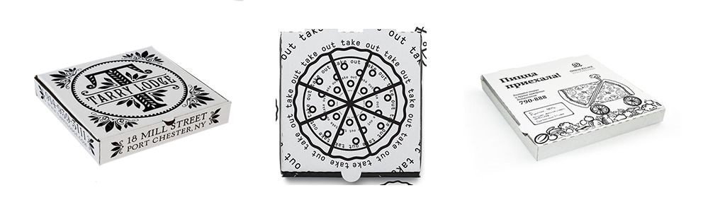 تصویر بالا نمونه های موفق از جعبه پیتزاهای تک رنگ چاپ می باشد که با رنگ سیاه طراحی شده است. همانطور که مشاهده می کنید با بکارگیری طراحی گرافیکی ساده و مشخص و با استفاده از تنها یک رنگ در طراحی جذابیت فوق العاده ای به وجود آورده است. استفاده از تمامی فضای جعبه پیتزا برای طراحی و همینطور ترکیب نوشتار و طرح های گرافیکی هارمونی خوبی را در طراحی این جعبه ها به وجود آورده است.