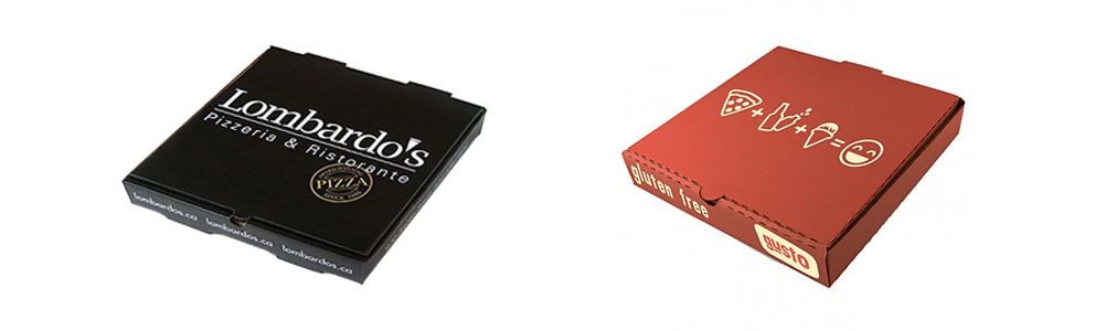 تصویر بالا نمونه های موفق از جعبه پیتزاهای تک رنگ چاپ می باشد که با رنگ سیاه طراحی شده است. همانطور که مشاهده می کنید با بکارگیری طراحی گرافیکی ساده و مشخص و با استفاده از تنها یک رنگ در طراحی جذابیت فوق العاده ای به وجود آورده است. استفاده از تمامی فضای جعبه پیتزا برای طراحی و همینطور ترکیب نوشتار و طرح های گرافیکی هارمونی خوبی را در طراحی این جعبه ها به وجود آورده است.