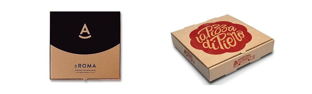 در تصویر فوق دو نمونه از جعبه پیتزا کرافت به نمایش درآمده است. اگر به آن ها دقت کنید متوجه خواهید شد که در طراحی و چاپ این جعبه های پیتزا نیز تنها یک رنگ با چاپ تقریبا تن پلات بکار رفته است. در این جعبه ها طراحی به گونه ای انجام شده است که بیشتر فضای رویه جعبه را با رنگ تخت پوشانده شده است و استفاده درست از نوشتار به همراه ترکیب نوشتار و رنگ با رنگ خود جعبه جذابیت زیادی را به وجود آورده است. با توجه به تصاویر قبلی می توان به این نتیجه رسید که نه تنها به کارگیری از یک رنگ در طراحی و چاپ جعبه پیتزا فارغ از نوع آن (تحریر و یا کرافت) موجب به وجود آمدن حس خوب در مشتریان و جذابیت جعبه پیتزا شده است، بلکه از نظر اقتصادی و هزینه های چاپ و تولید هم به صرفه بوده است.