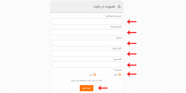 بعد از انتخاب ثبت نام وارد صفحه ای می شوید که در این بخش باید تمامی فیلدهای خالی نظیر نام و نام خانوادگی، شماره همراه، ایمیل و... را باید بطور کامل و دقیق پر نمایید و در آخر بر روی گزینه ثبت نام کلیک نمایید.